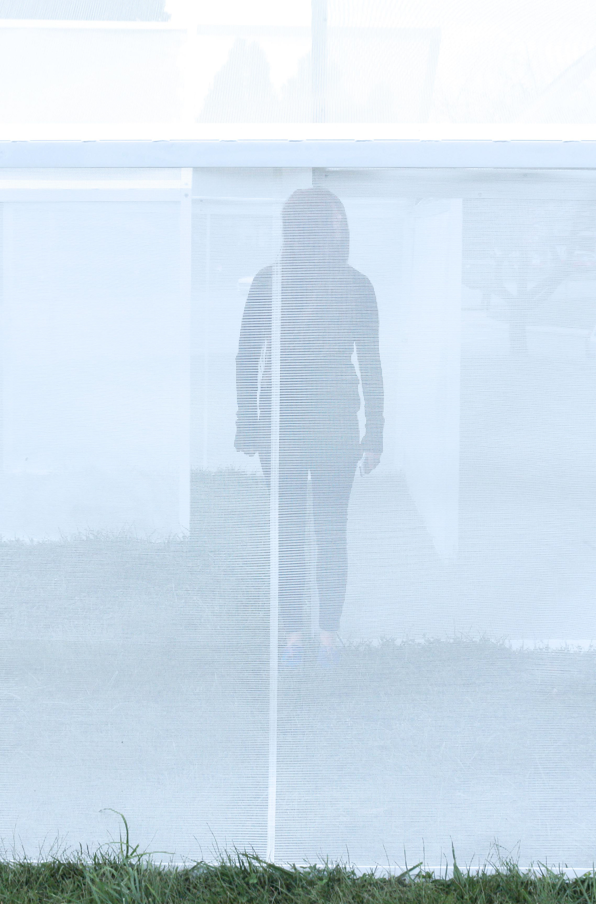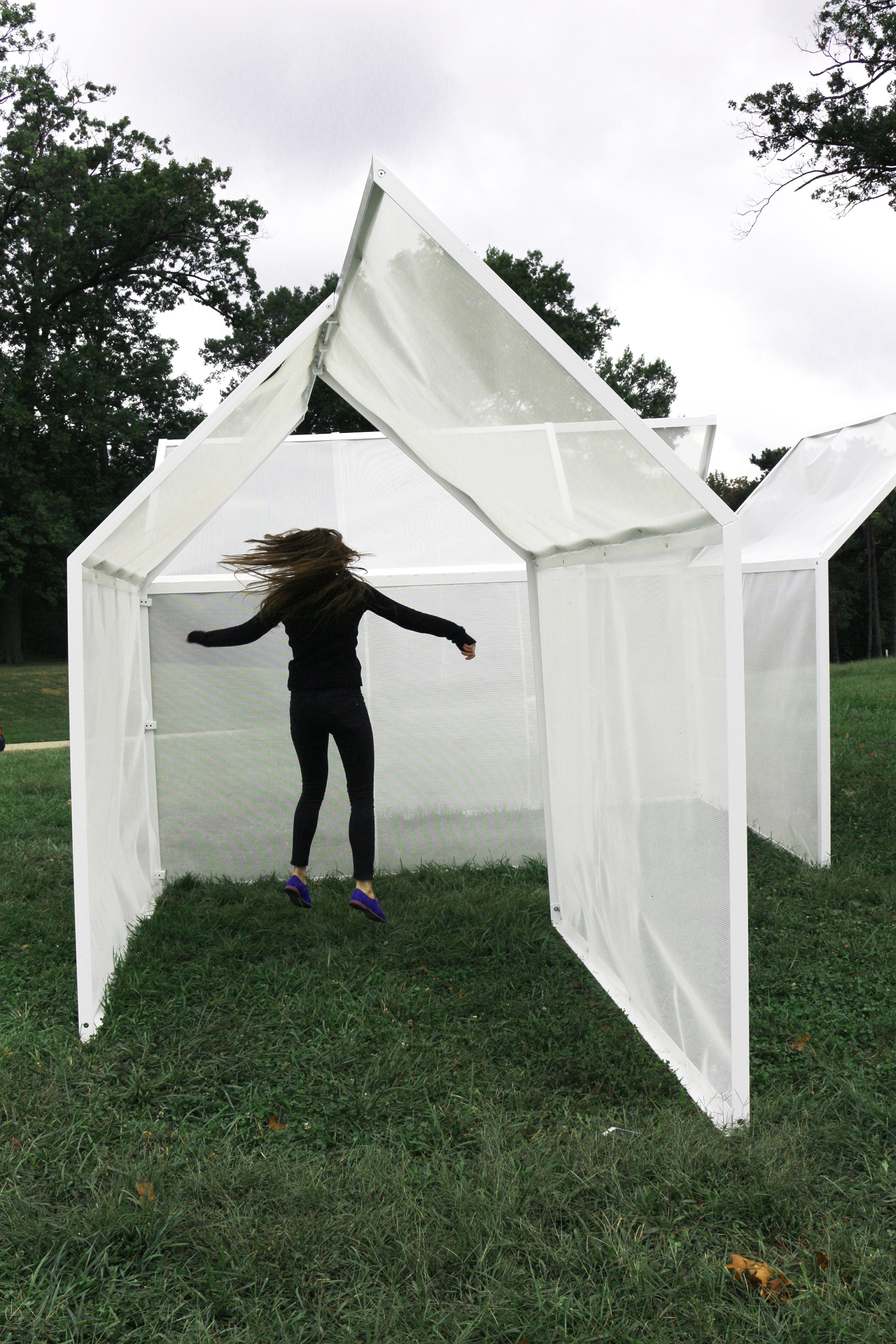 FRAME HAUS is an art pavilion made of steel and fabric. Three houses are offset and can be configured in a variety of directions. Each roof or wall can be left open or clad in fabric held on with magnets.