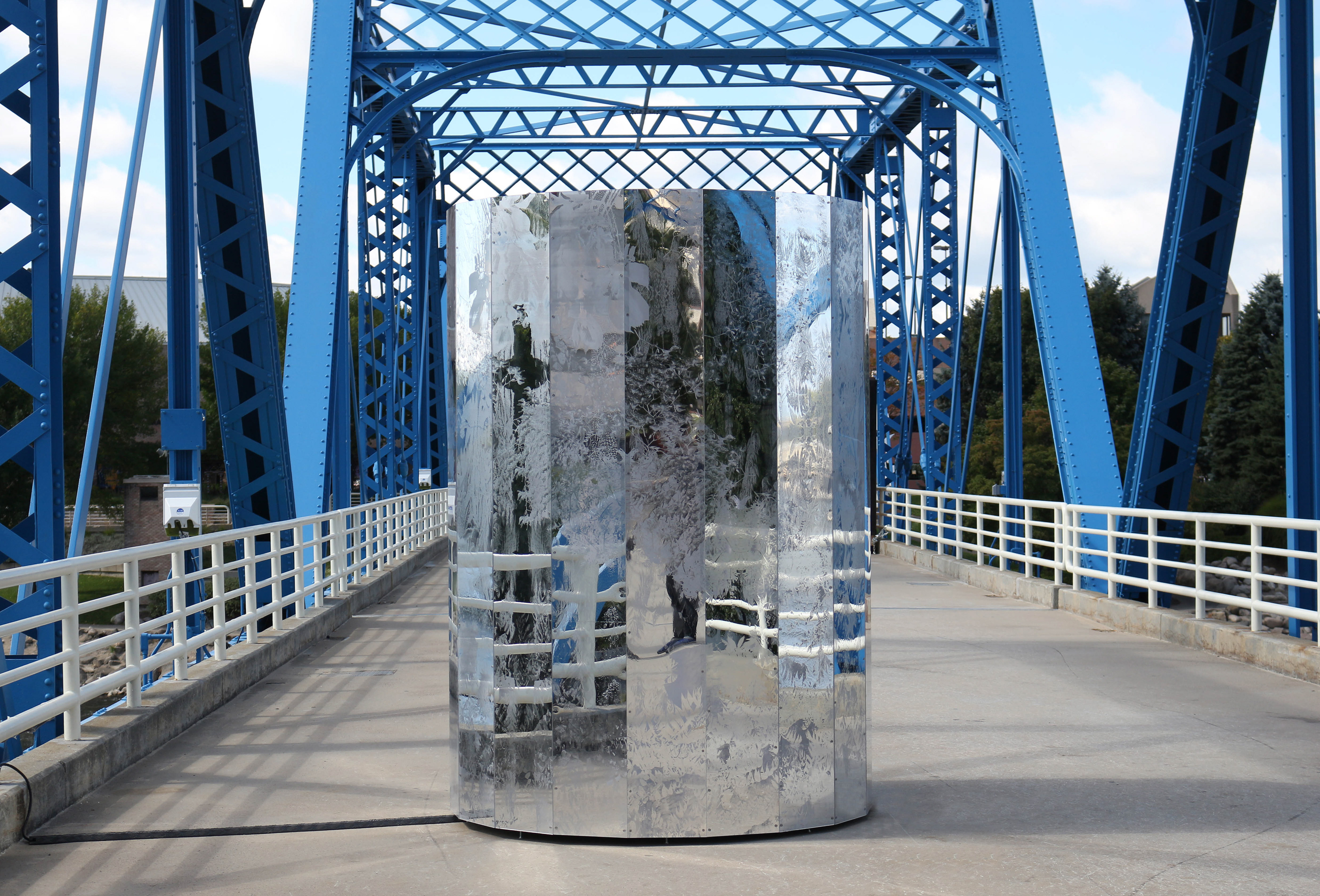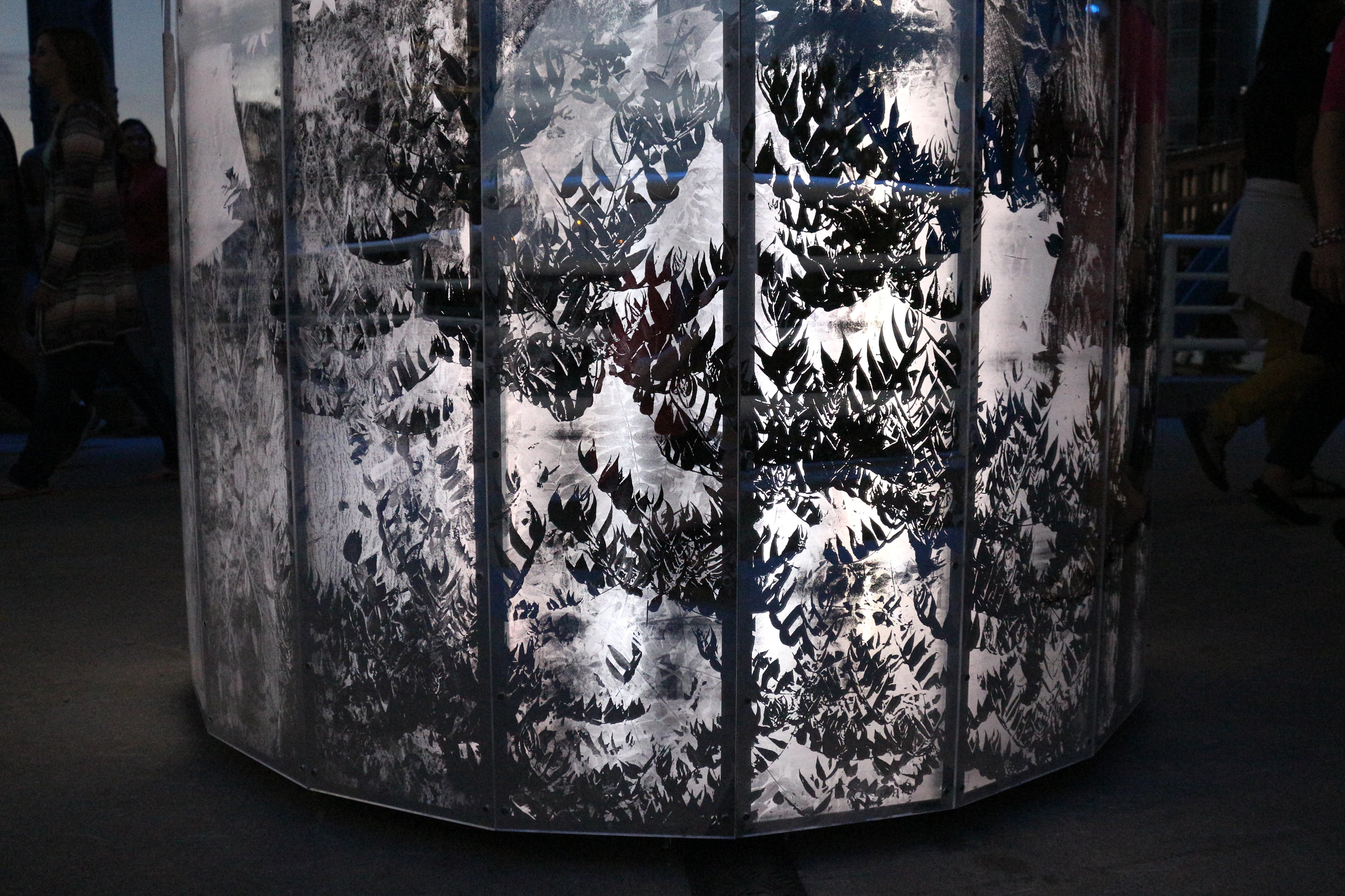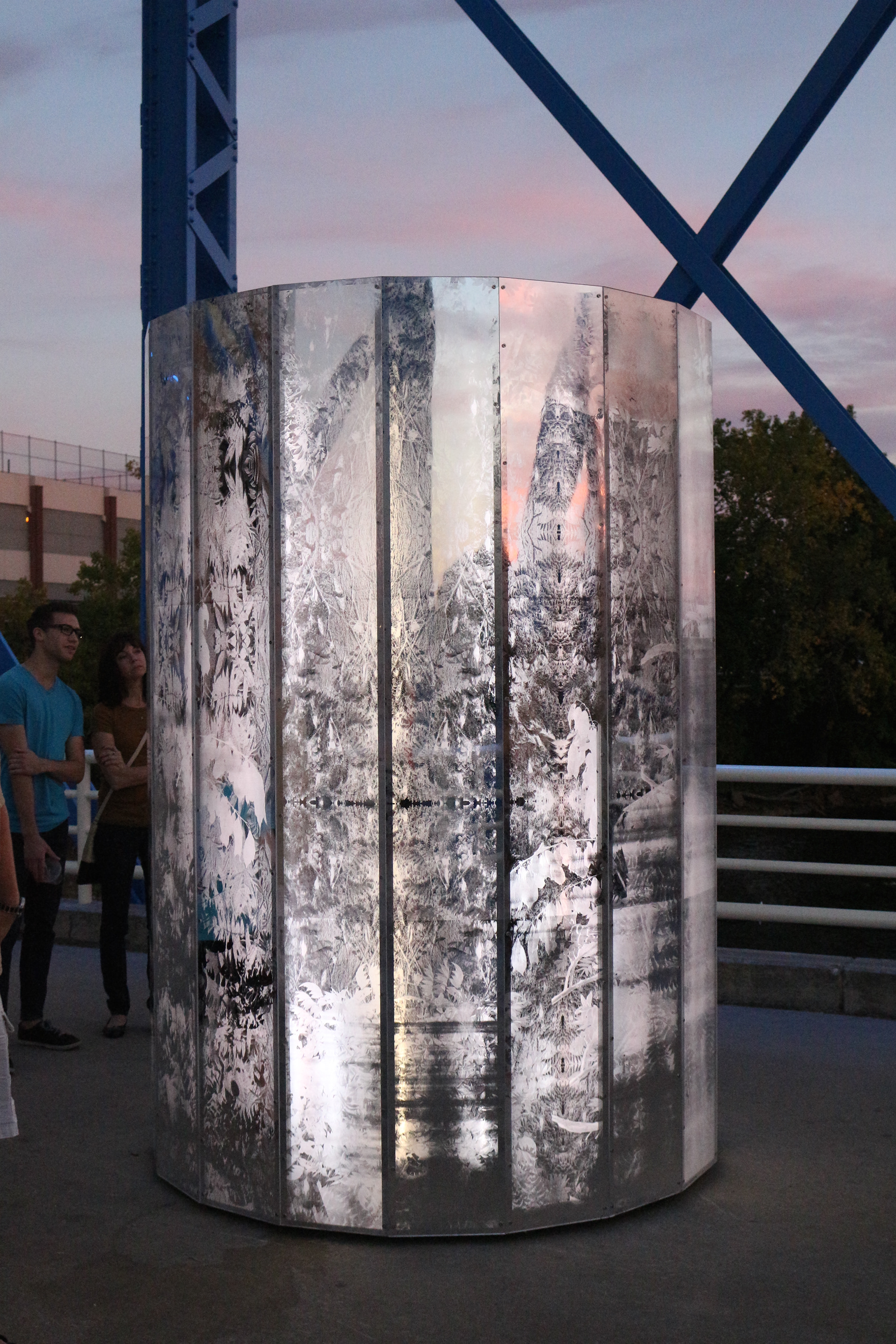 Valance is a site-specific piece of architecture engaging architectural theory, the problems of public space, and the private experience of art. Valance was exhibited during ArtPrize. The mirrored cylindrical structure creates an architectural folly as a small piece of architecture designed for the purpose of decoration. The sculpture appears structural and solid, yet the laser-etched mirrored surface refute its stability. This tension is at the heart of the design. The public viewed distorted reflections of the surrounding space and their own image. Valance operates as a decorative textile. Drawings and images from the artists family farm of cherry fields, traditional plants, landscapes and digital patterns combine into a ephemeral distortion of the mirror’s surface. This references toile fabric, used in the domestic setting, asserting a private experience in public space. Toile is connected to the first architecture or primitive hut, where the origin for texture and ornamentation came from nature. Dwellings and structures constructed of leaves, trees and wood inspired the design of ancient Greek temples. Later, Modernism eliminated the detail of ornamentation and texture, which suppressed the narrative potential of materiality. By etching into the cold mirror material, and damaging its purity through ornament, this installation juxtaposes nature/ culture, space/form and public/private. Valance becomes a curtain you can step into. People took images of themselves distorted through the digital "stitch." The laser subverted into a decorative tool. During the day, the mirror appeared opaque unless inspected closely, but at night the etched patterns glow from within as if indicating some source of magical power. The sculpture is interactive through peoples reflections occupying the surface, allowing for photographs of the self of group. The mirror asks us to question how we view ourselves and others.